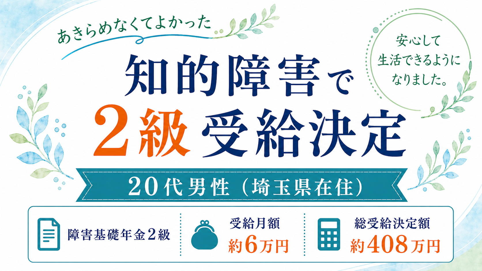 今回の事例では、埼玉県にお住まいの20代男性が、知的障害により障害基礎年金2級として認定され、月額約6万円、総額約408万円の受給が決定しました。
