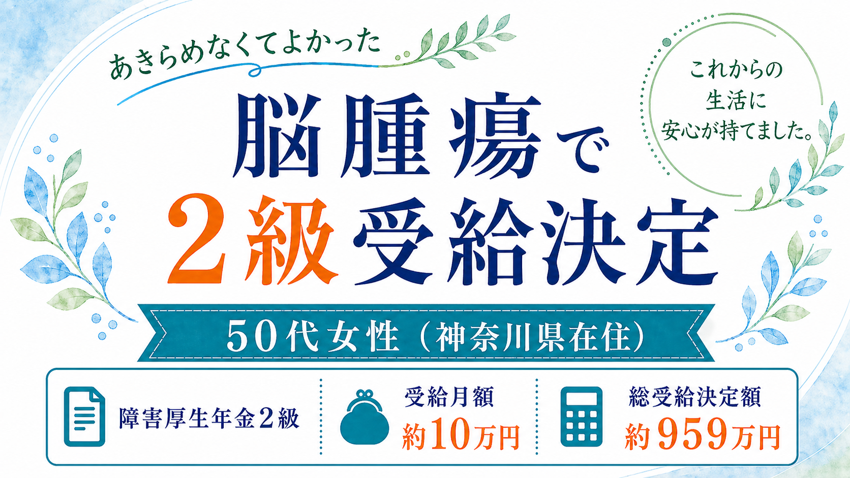 今回の事例では、神奈川県にお住まいの50代女性が、脳腫瘍により障害厚生年金2級として認定され、月額約10万円、総額約959万円の受給が決定しました。